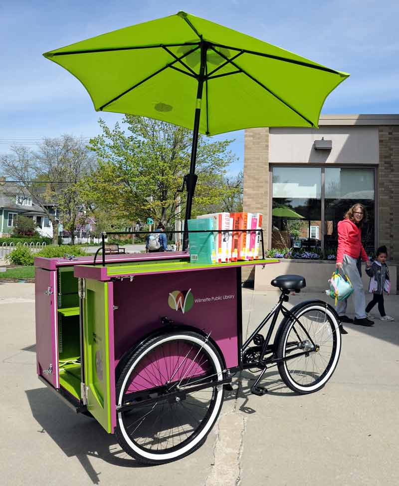 Professor Plum is our Book Bike, a bicycle with a large purple box in front to hold library materials. Staff members ride the bicycle to library events across town throughout the Summer, including park story times, the Wilmette French Market, and much more. The bicycle carries books and other library materials that are appropriate for each event. You can check out these items directly from the Book Bike, or even register for a new library card!