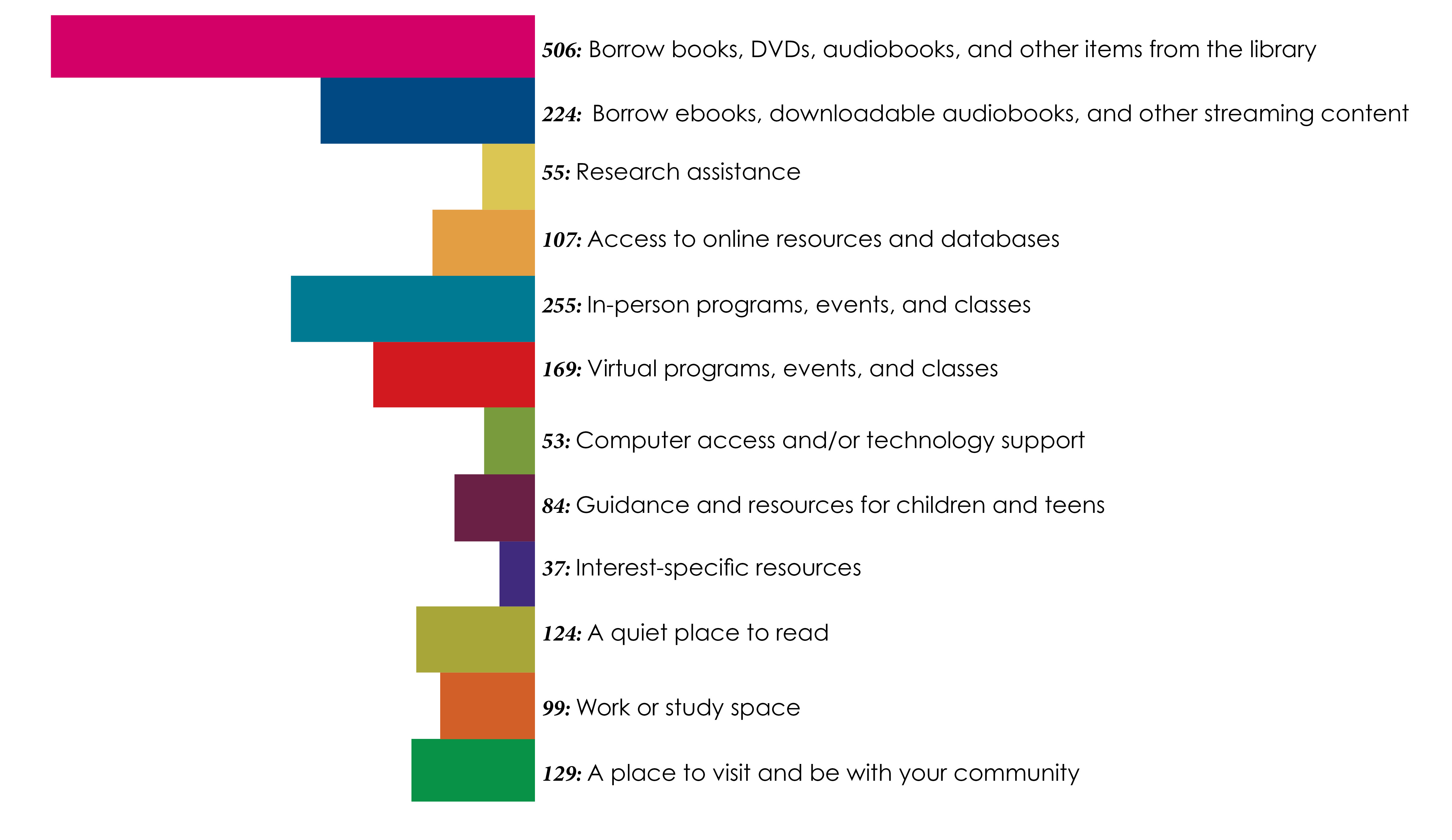 This spring, library leadership began a strategic planning process to help guide the library for the next three to five years. At the end of April, we surveyed the community to learn how you use the library and what you’d like to see from the library, and our community, in the future. We made the survey available on our website and in the library, and sent it out to the community in our email newsletter and on our facebook page. Over the course of two weeks, nearly 600 community members shared their ideas and aspirations for the library with us.