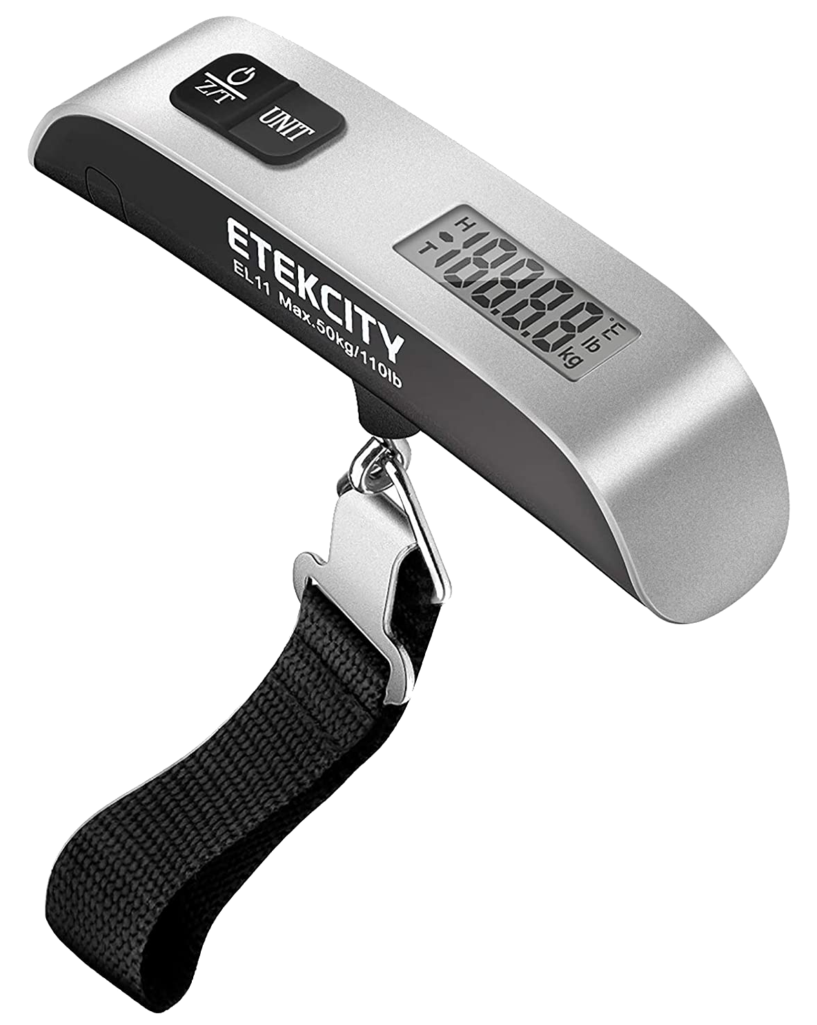 Hook your luggage onto this digital handheld scale to determine its weight. Weight capacity: 110lb/50kg.