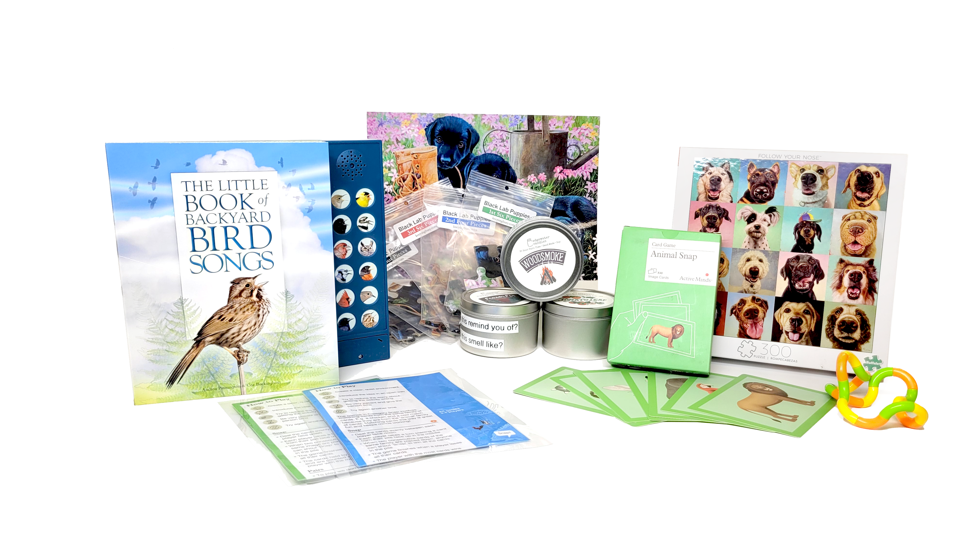 Arrangement of animal and outdoors-themed items found in the memory kit, such as a book that plays bird songs, a dog puzzle, a green animal card game, yellow and green fidget toys, and three candle tins.