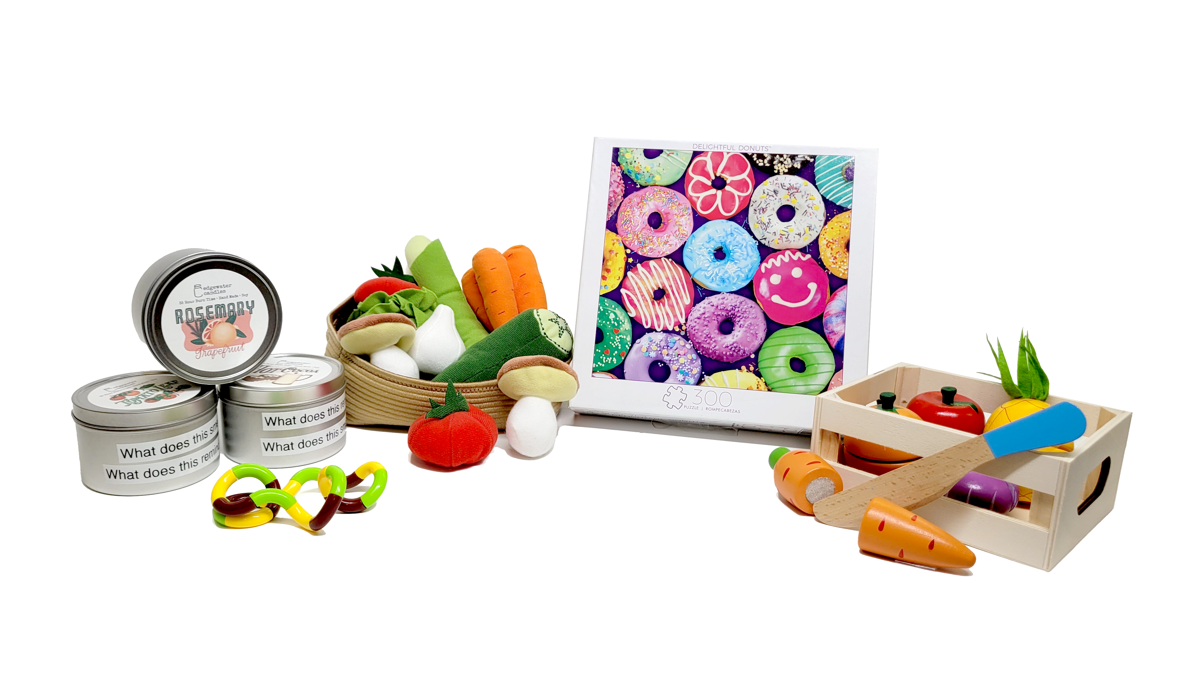Arrangement of food and outdoors-themed items found in the memory kit, including a colorful donut puzzle, a crate of wooden fruits and vegetables, a basket of cloth vegetables, a yellow and green fidget toy, and three scented candle tins.