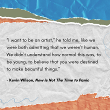 Join us this spring as we read and explore our 2023 One Book, Everyone Reads selection, Now Is Not the Time to Panic by Kevin Wilson! Everyone is invited to share their perspective at a book discussion, attend a program, and join us on May 11 when we welcome Kevin Wilson to our library to discuss his book.