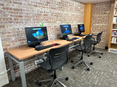 - Computers: There are four patron computers located in the Reference Area adjacent to the Reference and Technology Desk. Three computers have been installed (pictured) to mirror the existing three computers on the other side of the west lawn window.