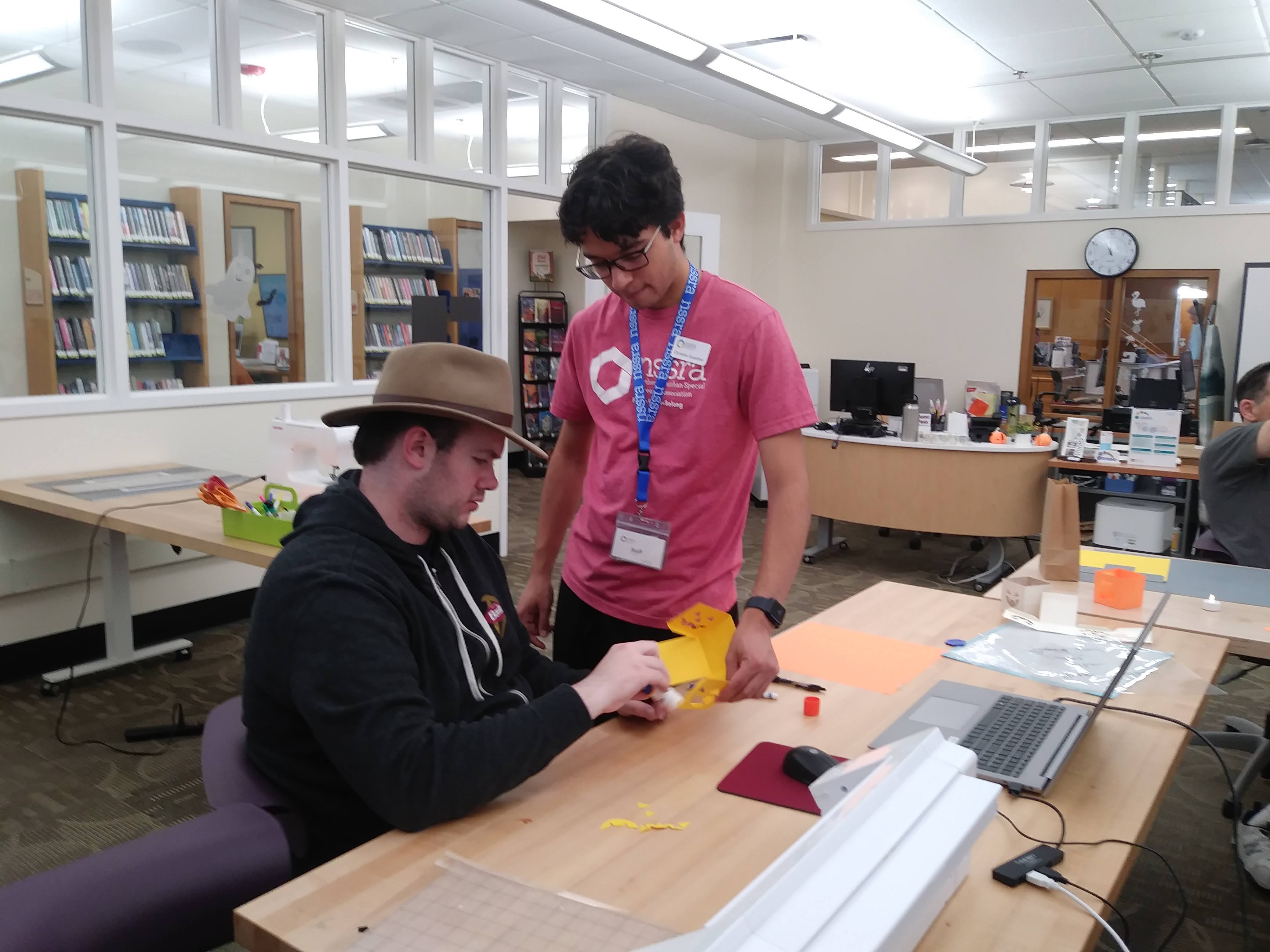 Two adults in The Studio working on a paper design after it was cut with the Silhouette Cameo.